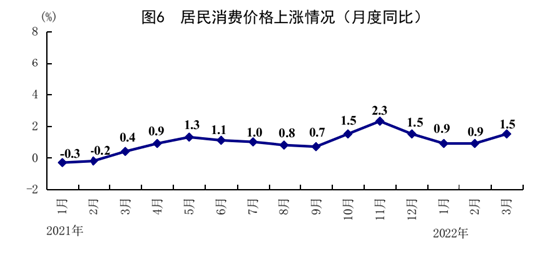 一季度,全国居民消费价格(CPI)同比上涨1.1%。其中,城市上涨1.2%,农村上涨0.7%。分类别看,食品烟酒价格同比下降1.3%,衣着价格上涨0.5%,居住价格上涨1.4%,生活用品及服务价格上涨0.6%,交通通信价格上涨5.5%,教育文化娱乐价格上涨2.6%,医疗保健价格上涨0.6%,其他用品及服务价格上涨0.7%。在食品烟酒价格中,粮食价格上涨1.7%,鲜果价格上涨6.9%,鲜菜价格上涨3.7%,猪肉价格下降41.8%。扣除食品和能源价格后的核心CPI同比上涨1.2%。3月份,全国居民消费价格同比上涨1.5%,涨幅比上月扩大0.6个百分点;环比持平。