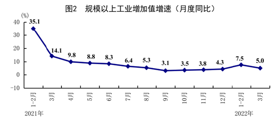 一季度,全国规模以上工业增加值同比增长6.5%。分三大门类看,采矿业增加值同比增长10.7%,制造业增长6.2%,电力、热力、燃气及水生产和供应业增长6.1%。高技术制造业、装备制造业增加值分别增长14.2%、8.1%,增速分别比规模以上工业快7.7、1.6个百分点。分经济类型看,国有控股企业增加值同比增长5.0%;股份制企业增长7.8%,外商及港澳台商投资企业增长2.1%;私营企业增长7.6%。分产品看,新能源汽车、太阳能电池、工业机器人产量分别增长140.8%、24.3%、10.2%。3月份,规模以上工业增加值同比增长5.0%,环比增长0.39%。3月份,制造业采购经理指数为49.5%,企业生产经营活动预期指数为55.7%。1-2月份,全国规模以上工业企业实现利润总额11576亿元,同比增长5.0%。